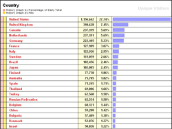 | Geo - Countries Report Where do your visitors come from? Here you can see it! You can be sure you won't mis a country! Also available is a Continents report. History Graphs available for all countries & continents! |