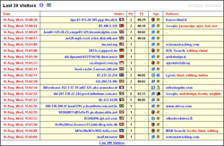 | Last 20/300 Visitors Report Here you can see your visitors listed including their IP, Browser and Operating System. You can click on any of the visitors to get all information tracked for the selected visitor, this includes the referrer, keywords, the path they traveled and more! |