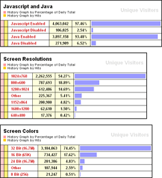 | Extra System Reports You can also see how many visitors have Java or Javascript enabled/disabled and the Screen Resolutions/Colors they're using. Also here History Graphs available! |