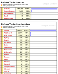 | Referrers Report Here you can see where you're visitors are coming from. Reported by kind of referrer source, searchengines, website referrers and more. Also a search engine specific report shows you which searchengines send you the highest number of visitors. Also available the keywords your visitors were using to find you site. History Graphs! |