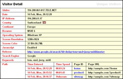| Visitor Details Report This report shows you in detail all information we track about a visitor, including system information, referrer, searchengine, keywords and the path the visitor traveled through your site! |