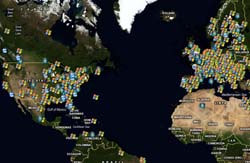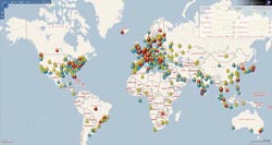 | On the Map Fantastically fun feature of the Non Public Tracker V3.2 is the 'On the Map' section. You can see your last 1000 visitors on the map! Full screen, zoomable to street level & bird's eye, mouse overs with visitor details, specific selections and much more! This screenshot is sized down from 1920x1200 for displaying purposes. You can go as large as your display allows! |